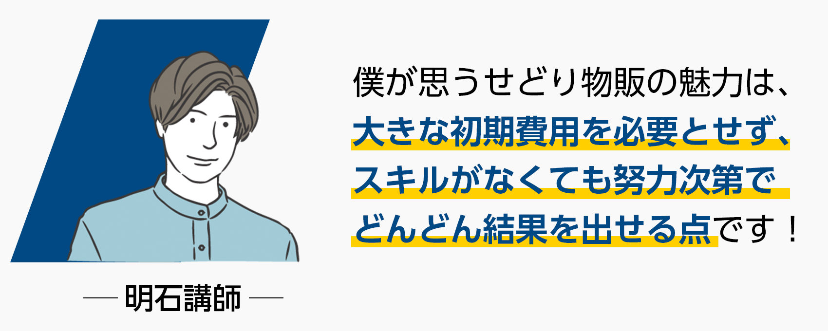 実際に他の副業で結果が出なかったけど、せどりで結果を出している受講生はいらっしゃいますので、ぜひ挑戦してみてください。