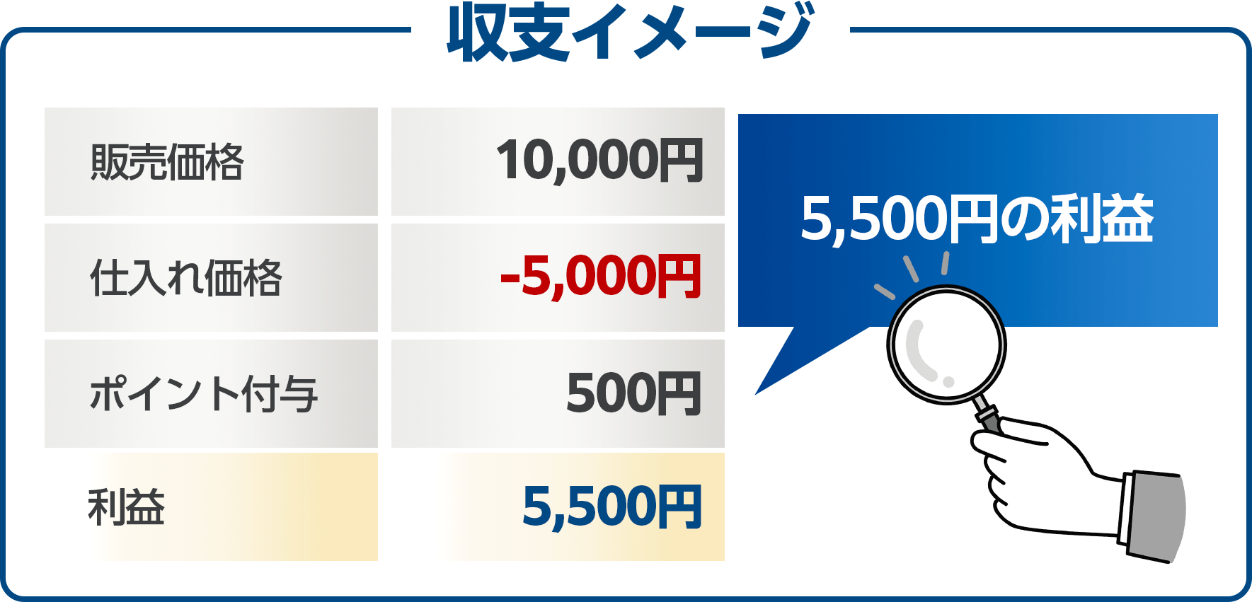 10,000円から仕入れ代金の5,000円を引くと、利益が5,000円、そこに付与された500ポイントも利益となりますので、トータル5,500円の利益が得られることになるんですよ。