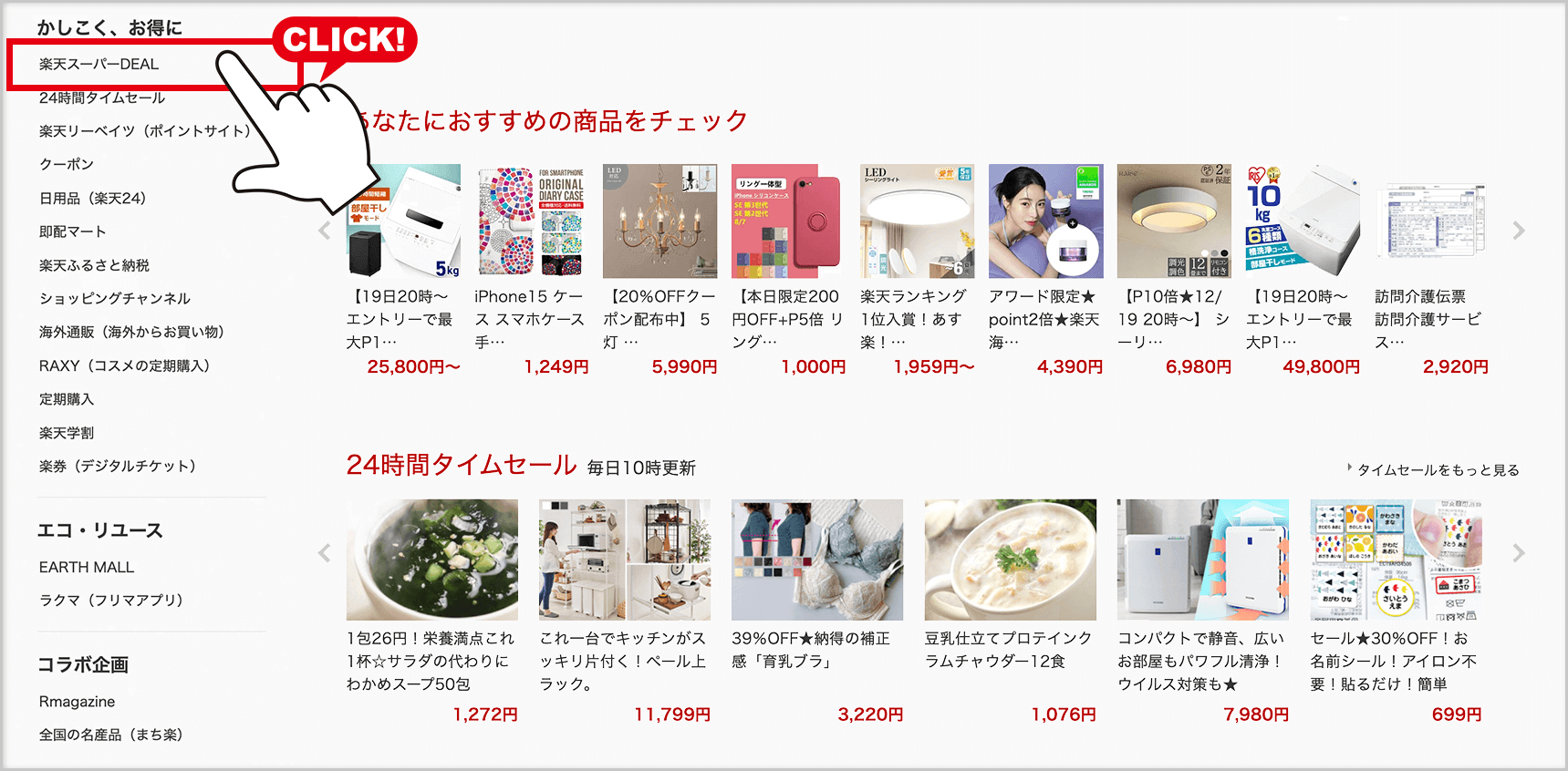 対象商品は楽天市場の「楽天スーパーDEAL」というメニューから簡単に探せます。